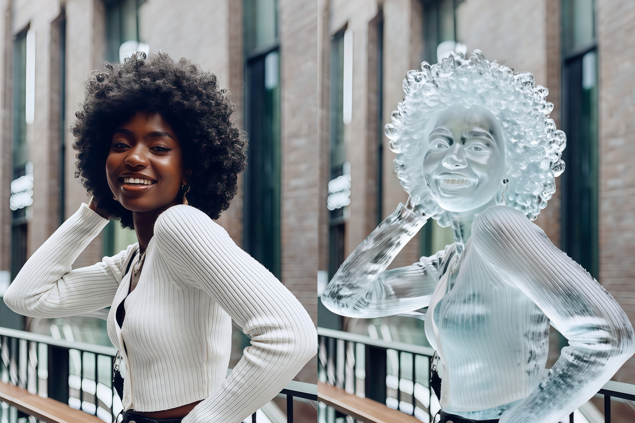 Change the person to a transparent ice sculpture material | Remove the people in the background in this image |