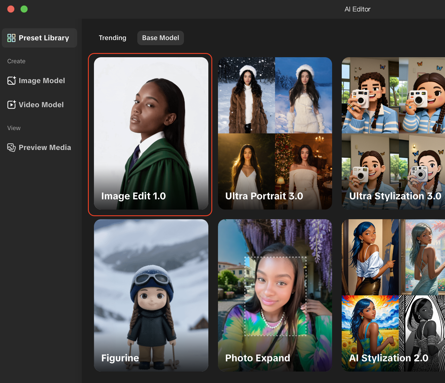 Access Image Edit 1.0 in AI Editor, under Base Model.